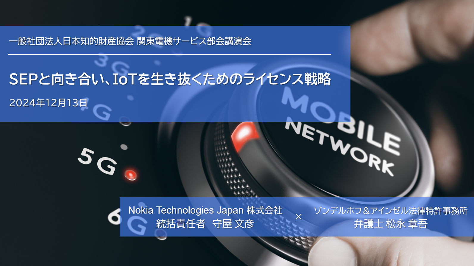 弁護士松永章吾が 日本知的財産協会 関東電機サービス部会にて「SEPと向き合い、IoTを生き抜くためのライセンス戦略」と題する講演を行いました。 12月 14, 2024 最終更新日時 : 11月 20, 2025 Shogo Matsunaga 弁護士松永章吾が 日本知的財産協会 関東電機サービス部会にて「SEPと向き合い、IoTを生き抜くためのライセンス戦略」と題する報告を行いました。